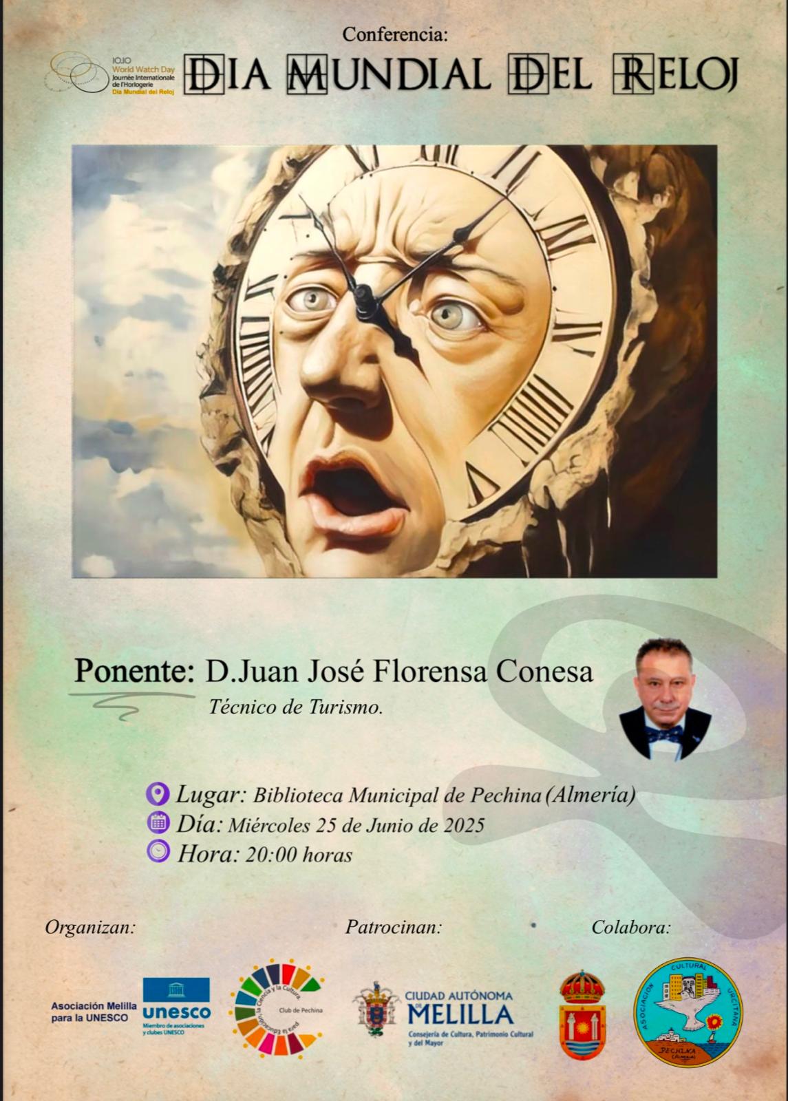 El miércoles 25 de junio a las 20:00 horas en la Biblioteca Pública de Pechina (Almería) será impartida la Conferencia: “El Día Mundial del Reloj”. Su ponente es Juanjo Florensa que es Técnico de Turismo, conferenciante y habitual colaborador de medios de prensa en España y Marruecos. Es uno de los directivos de la Asociación Melilla para la UNESCO en las áreas de animación Socio-Cultural. La conferencia informará de la difusión de este día que será celebrado oficialmente por primera vez el próximo 10 de octubre de 2025. Esta fecha es una alusión a la posición habitual de las agujas del reloj 10.10 con la que los relojes aparecen en vitrinas y catálogos por razones de marketing. El anuncio de este día se produjo el pasado 7 de abril en el marco de la feria relojera de Ginebra conocida como “Watches &Wonders”. Con ello se materializa un día para la celebración oficial después del reconocimiento en el año 2020 a la Relojería por parte de la UNESCO como Patrimonio Cultural Inmaterial de la Humanidad, tras la propuesta conjunta realizada por Francia y Suiza en 2019.