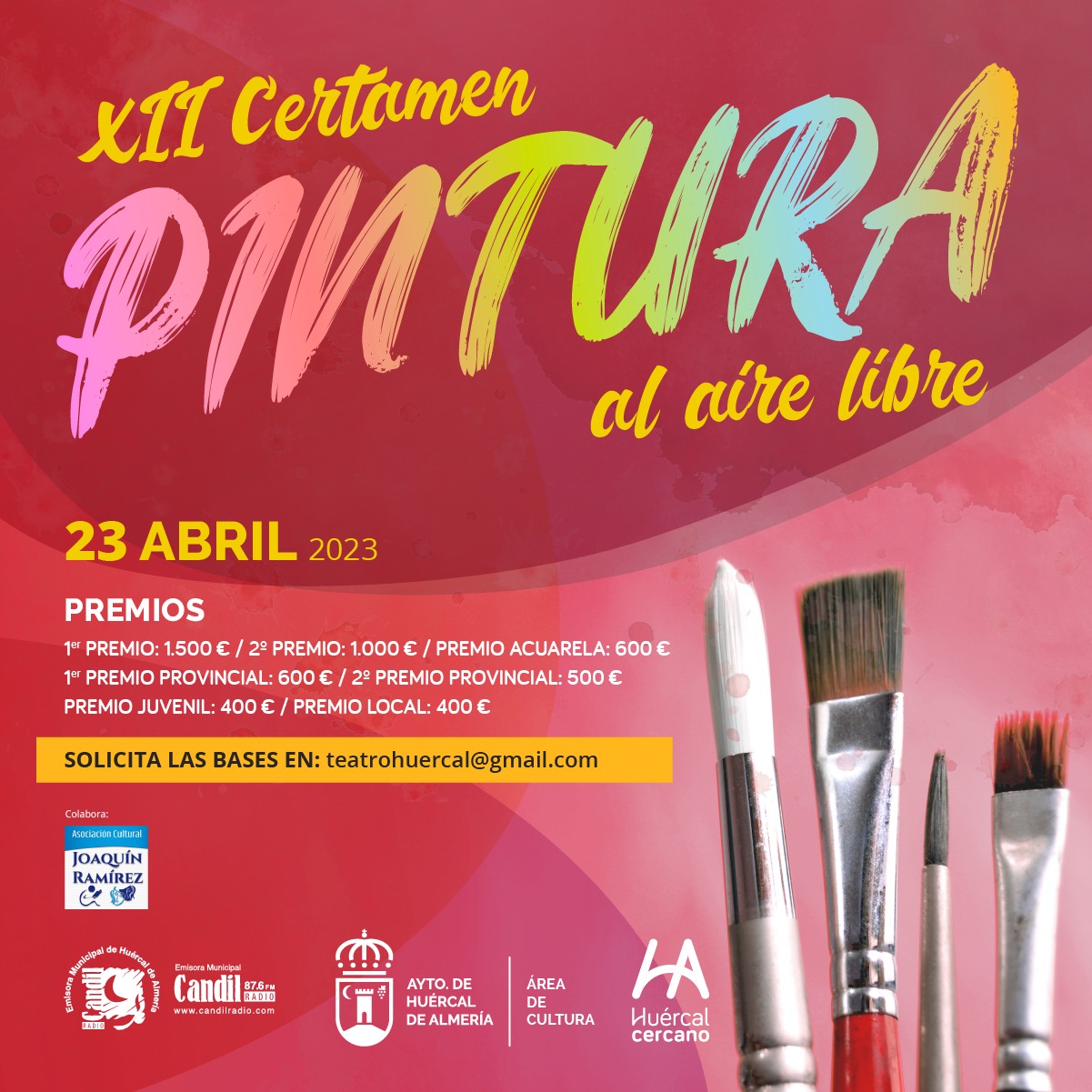 EL AYUNTAMIENTO CON LA COLABORACIÓN DE NUESTRA ASOCIACIÓN pone en marcha la celebración del XII. CERTAMEN DE PINTURA AL AIRE LIBRE «HUÉRCAL DE ALMERÍA» «Durante estos días continuaremos informando». Compartir esta publicación Share on FacebookShare on Facebook Share on XShare on X Share on WhatsAppShare on WhatsApp
