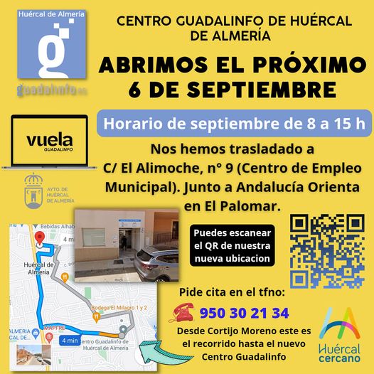 Comienzo de nuevo al frente del Centro Guadalinfo DL Huércal de Almería en su nueva ubicación que ya es definitiva. Después de dos años arropada por los compañeros de Candil Radio, Juan Miguel Gonzalez Roman (Juancho) y Antonio Francisco Almecija Blanes a los que quiero dar las gracias por todo, os echaré de menos, nos trasladamos al Centro Municipal de Empleo en Calle El Alimoche, 9 junto a Andalucía Orienta en el barrio de El Palomar donde podré seguir acompañando y formando a mis vecinos en Tecnologías de la Información y la comunicación (TIC) como nuevo Agente de Innovaciones Tecnológicas del Ayuntamiento de Huércal de Almería.