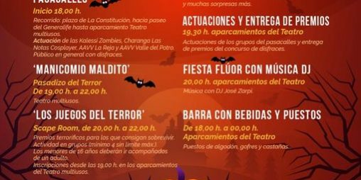 PASACALLES, con inicio a las 18:00 horas desde la plaza de la Constitución y actuaciones de las Kalessi Zombies, Charanga Las Notas Cosplayer, asociaciones de vecinos La Reja, Valle del Potro y El Cercadito, público en general con disfraces