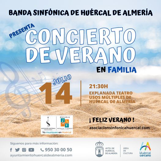 Este jueves 14 de julio, a las 21:30 horas en la explanada del Teatro Multiusos de Huércal de Almería, Concierto de Verano en Familia con la Banda Asociación Sinfónica de Huércal de Almería. Entrada gratuita.