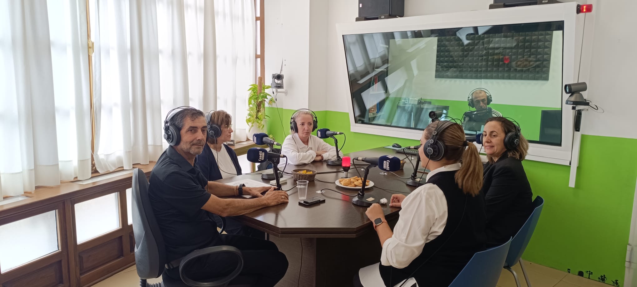 Con el concejal Manu Abad + Inma (directora) + Estefanía (docente) + Ana María y Mª del Mar (alumnas) + Almécija, en Días de Radio.