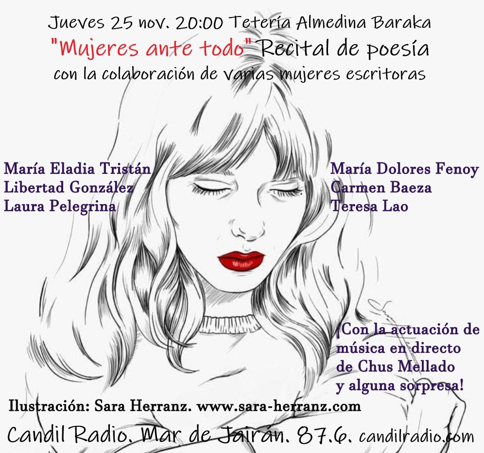 Y os recordamos la cita que tenéis este próximo jueves en el Restaurante Teteria Almedina Baraka con el recital poético «Mujeres ante todo».