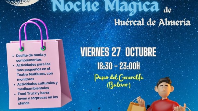 El viernes 27 de octubre, nos vamos de compras de 18:30 a 23:00 horas por el Paseo del Generalife Llega la Noche Mágica de Huércal…